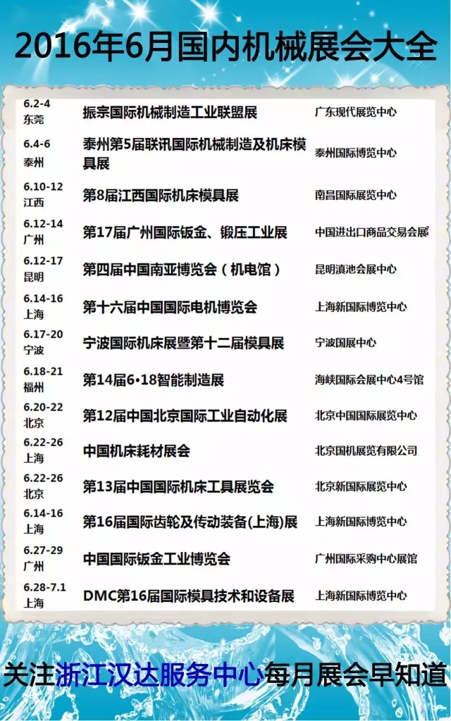 廣大工業機械從業者們,我們整理了2016年6月份展會一覽,展會時間、名稱、地點均有一一核對檢查,確保無誤,請各位放心參考。
